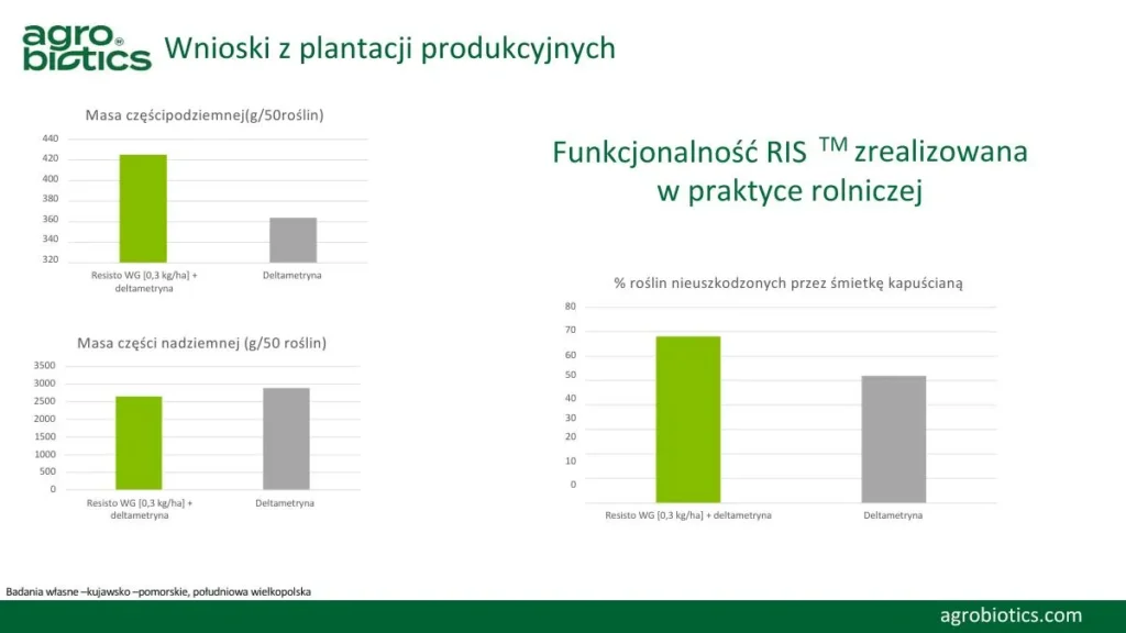 Po zastosowaniu Resisto WG można zaobserwować mniejszą liczbę korzeni uszkodzonych przez larwy śmietki kapuścianej. Dodatkowo rośliny charakteryzują się wyższą masą korzeni, co zwiększa ich odporność na szkodniki.